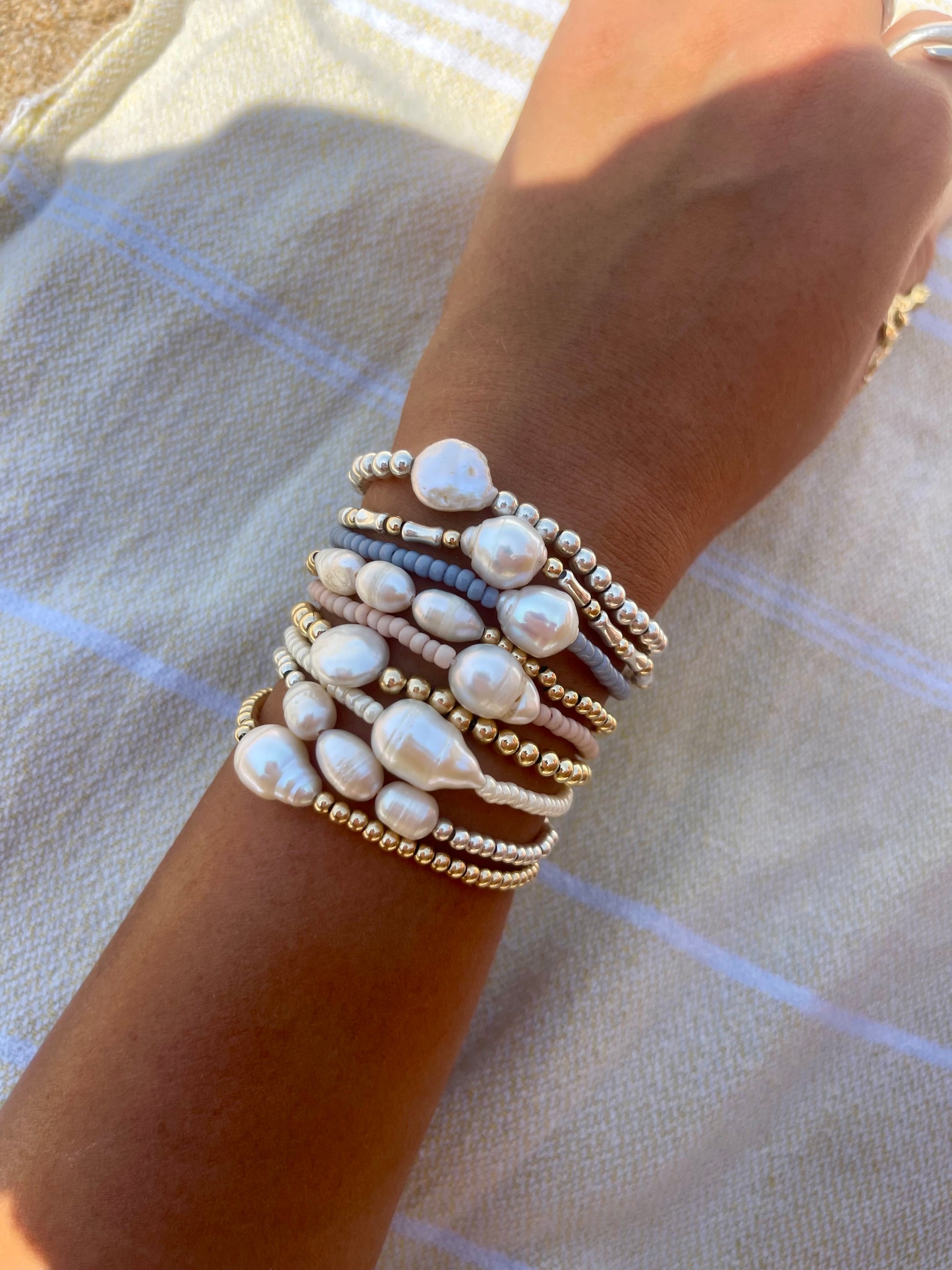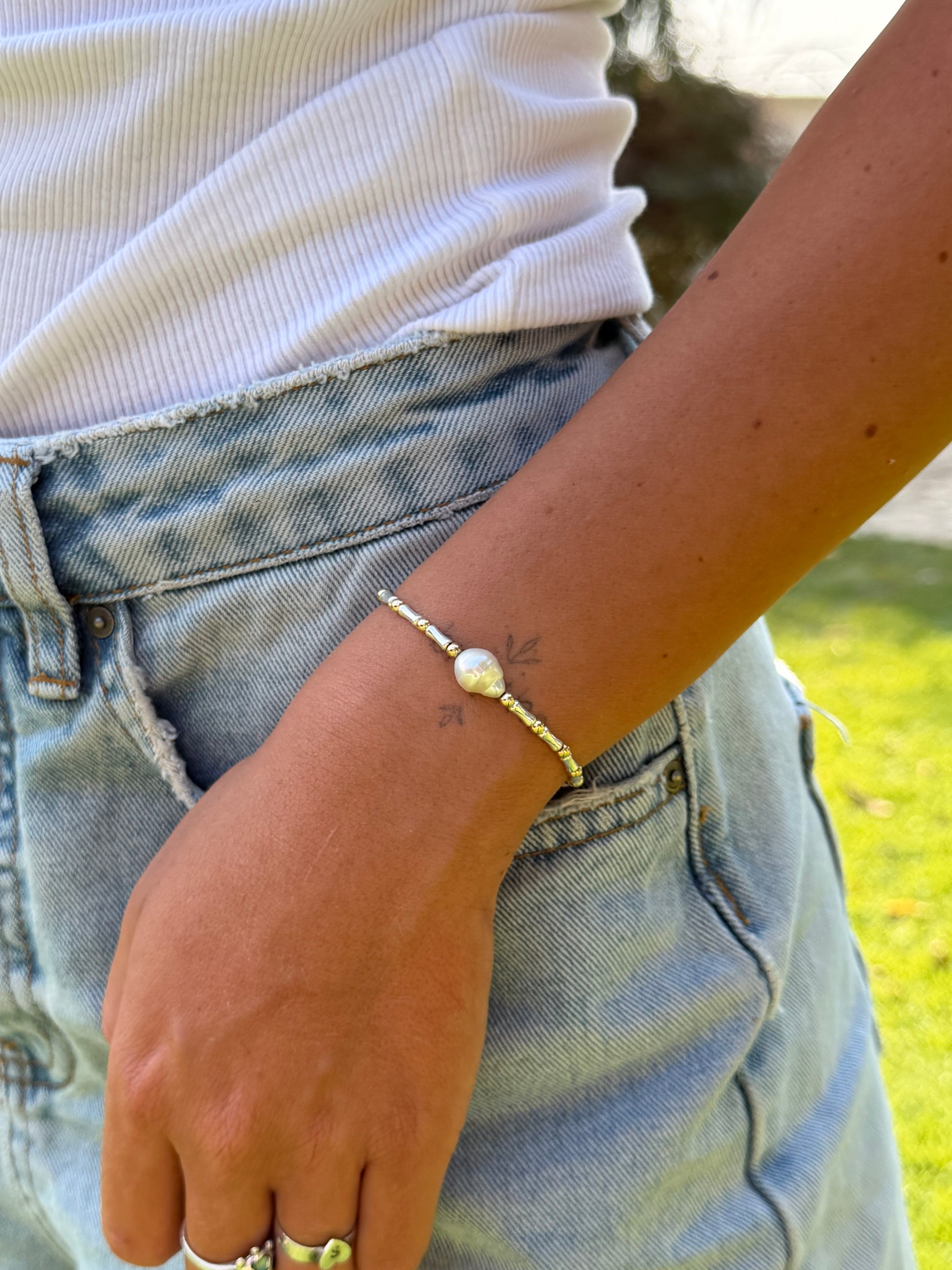 הצמיד עשוי מחרוזי כסף סטרלינג 925 , חרוזי גולדפילד וחרוז פנינה טבעית