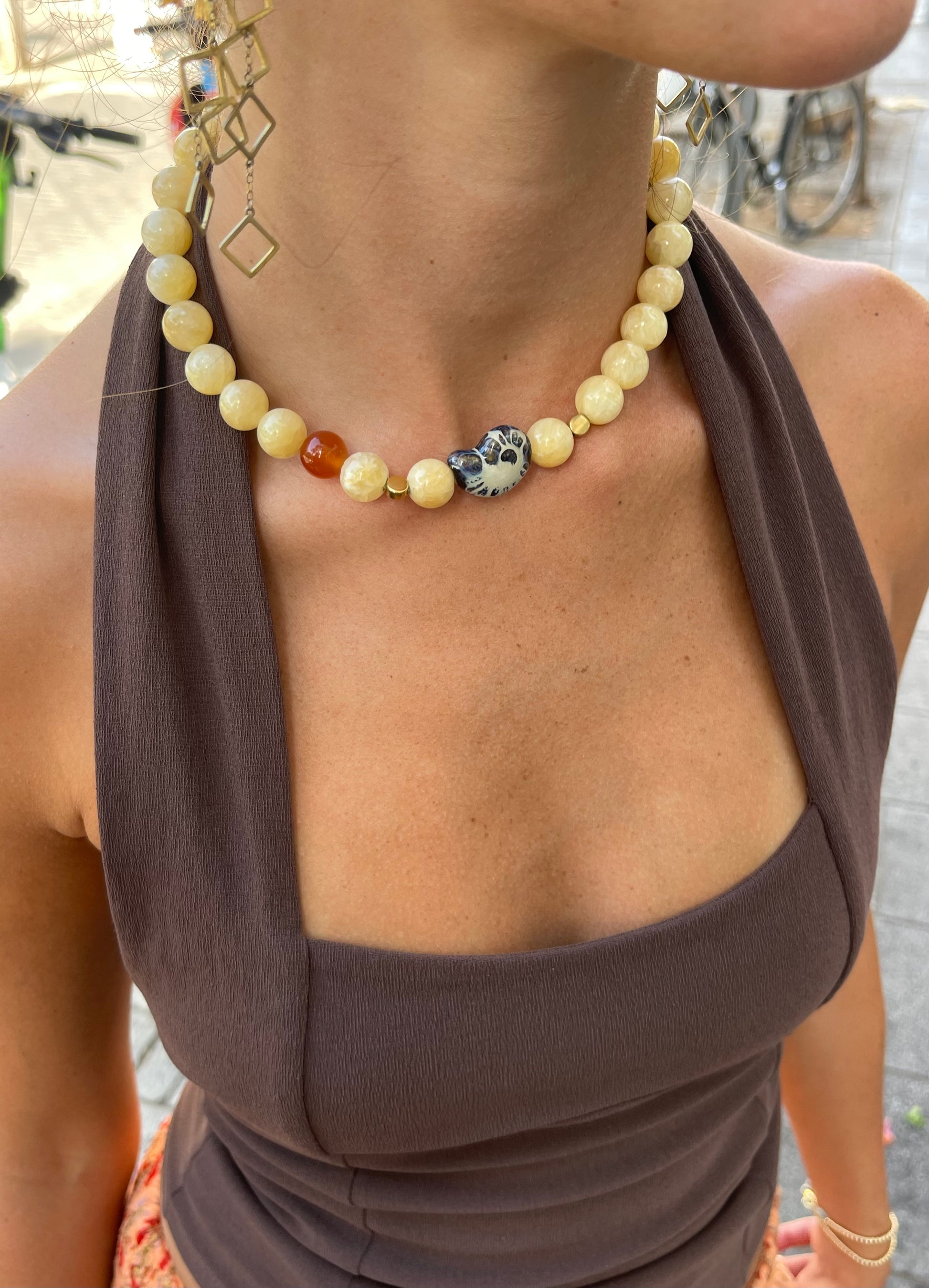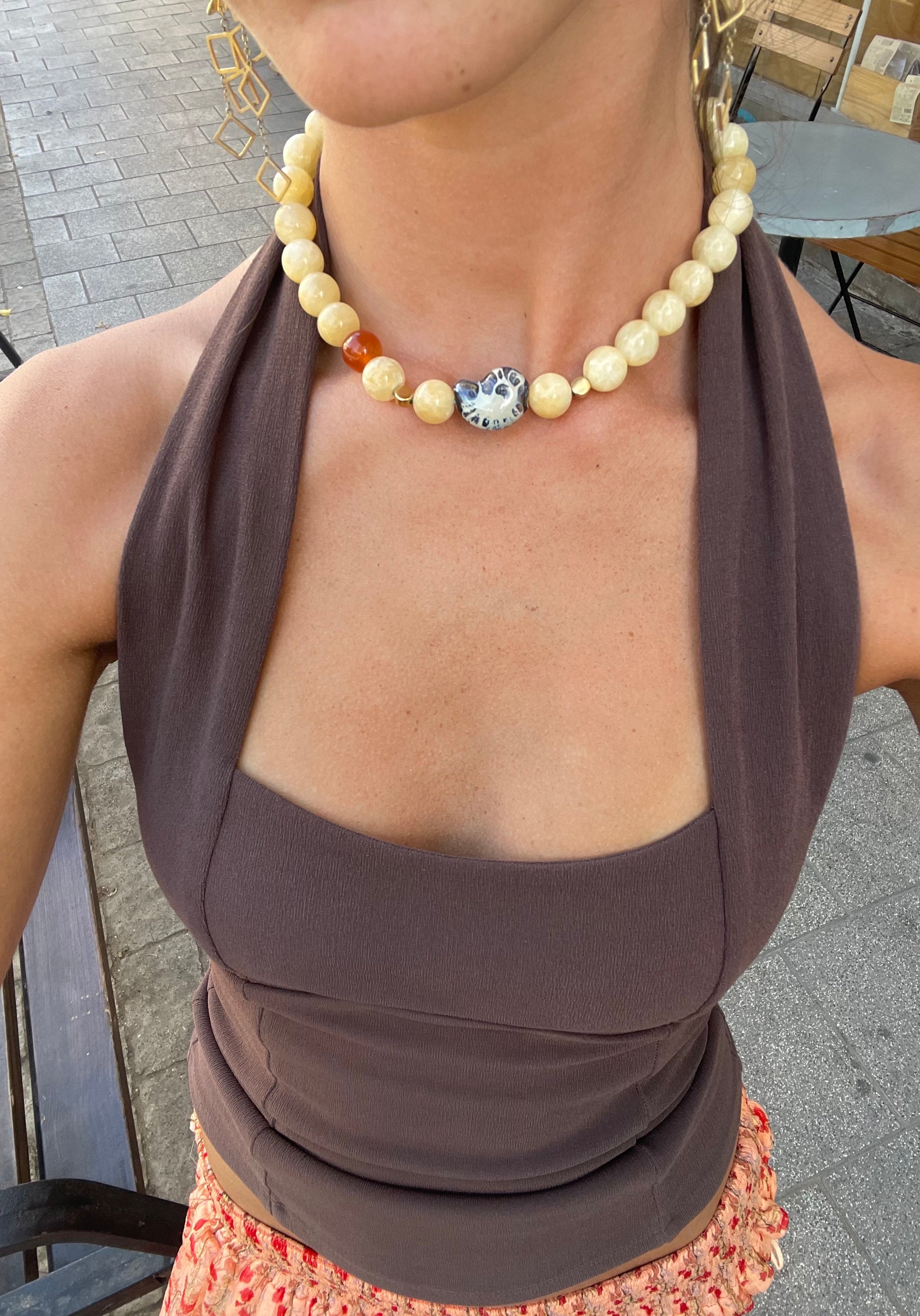 שרשרת מאבני קלציט צהובות בשילוב חרוז כתום קרניאול, חרוזי זהב ותיליון קרמיקה של מאובן מהים