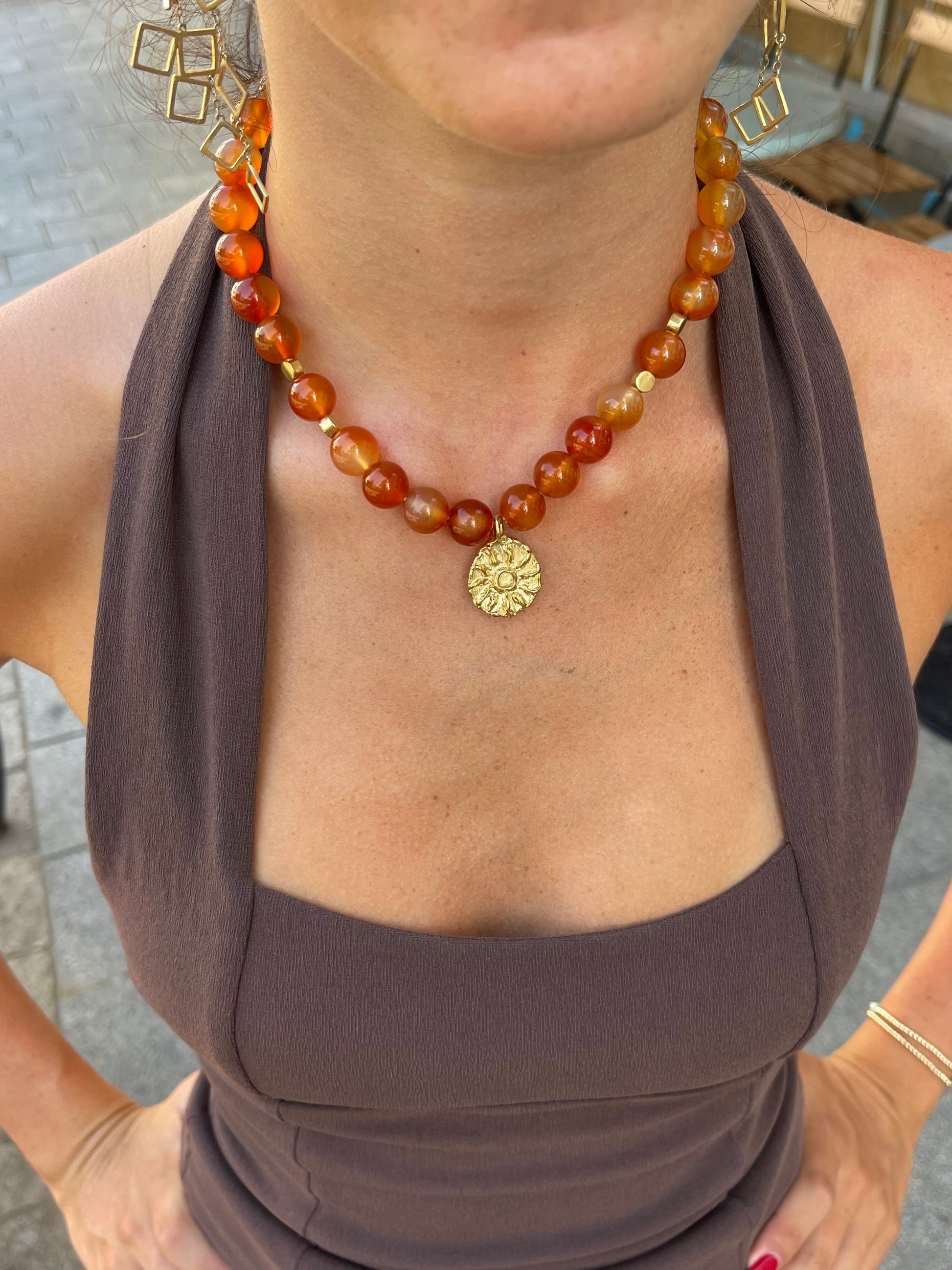 שרשרת עם אבני קרניאול חרוזי זהב ותיליון סני