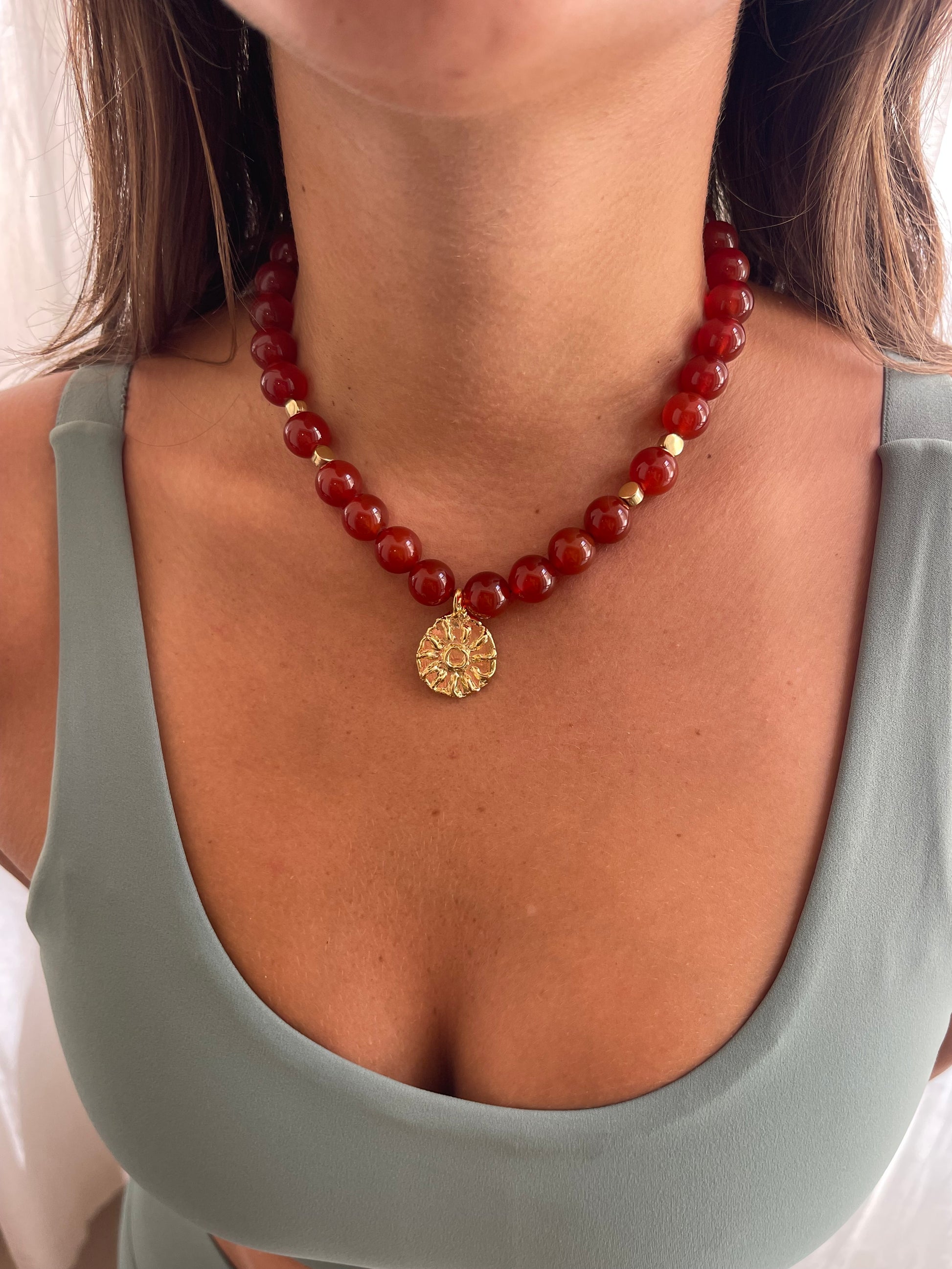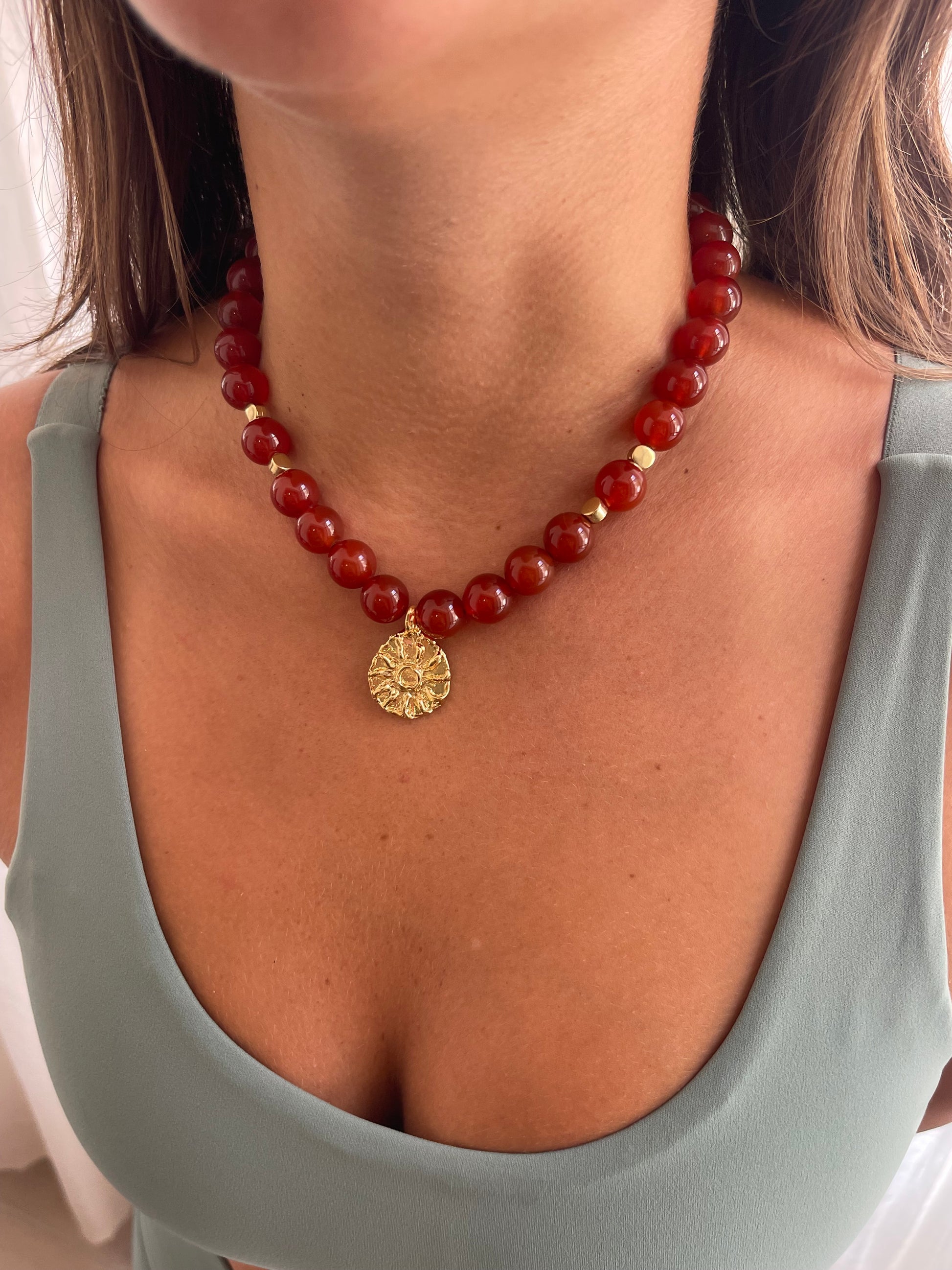 שרשרת עם אבני קרניאול חרוזי זהב ותיליון סני