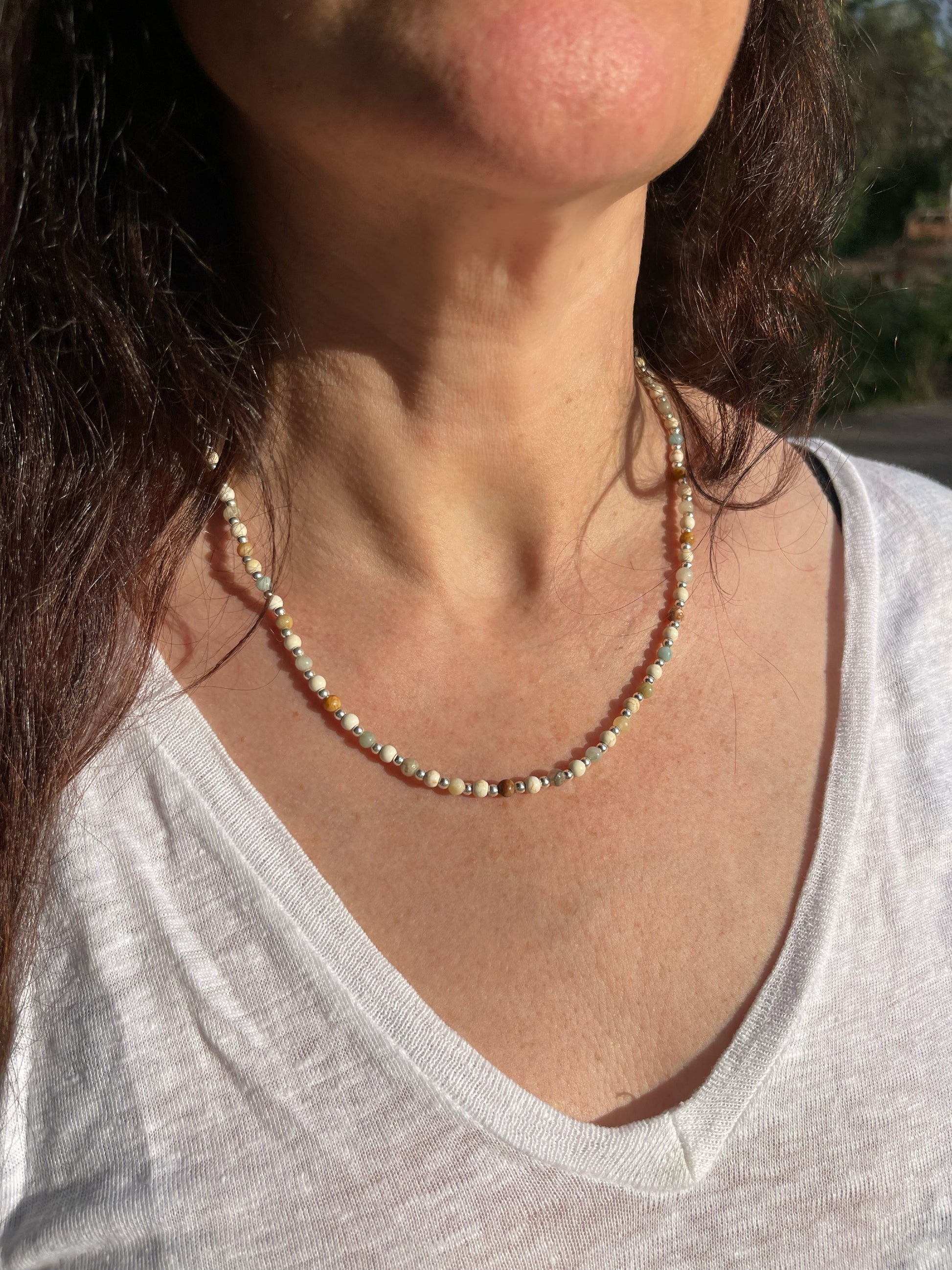 שרשרת שזורה בעבודת יד עם אבני חן וחרוזי כסף סטרלינג 925. אורך השרשרת על בתמונה 50 ס״מ
