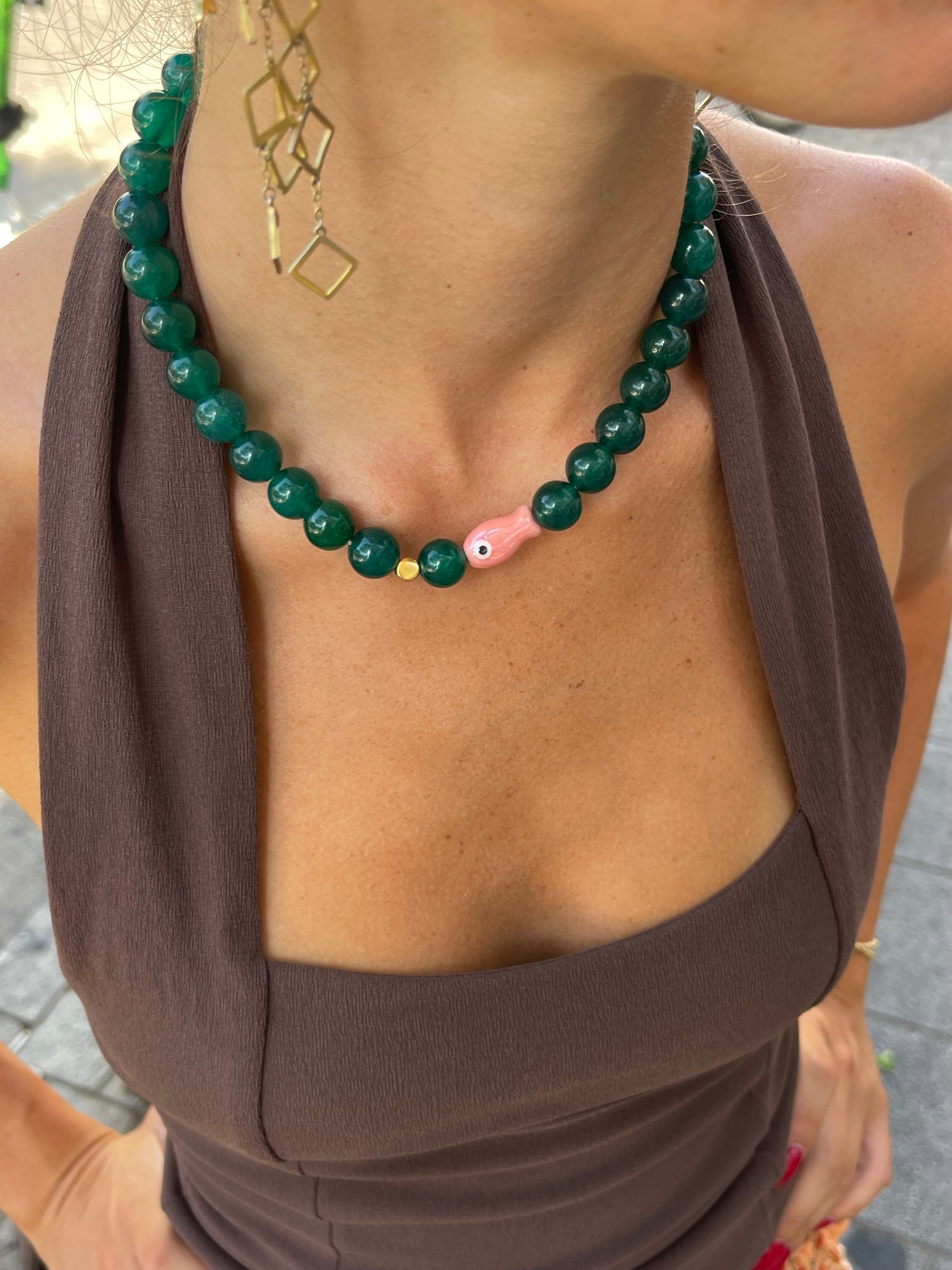 שרשרת מאבני אגט ירוק בשילוב תיליון דג ורוד(ניתן לשנות את צבע הדג) עם חרוז זהב
