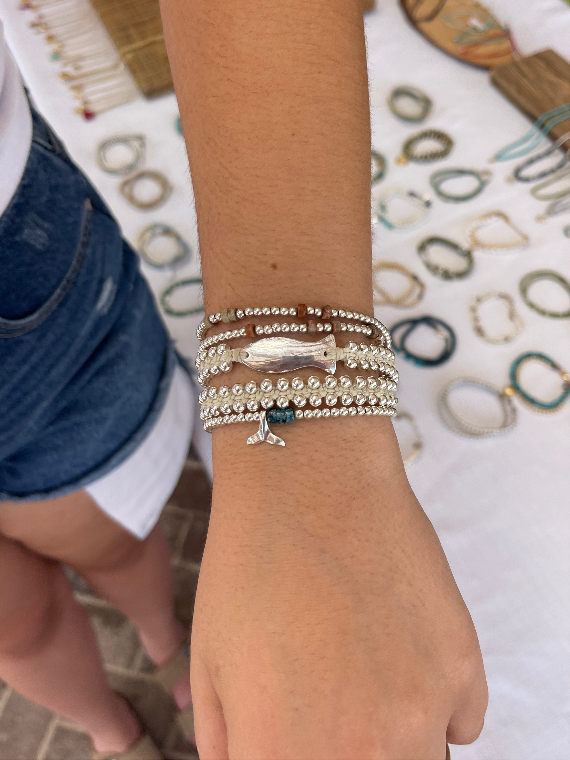 צמיד דג שזור בעבודת יד עם חוט שעווה בצבע (כחול רויאל) וחרוזי כסף סטרלינג 925
